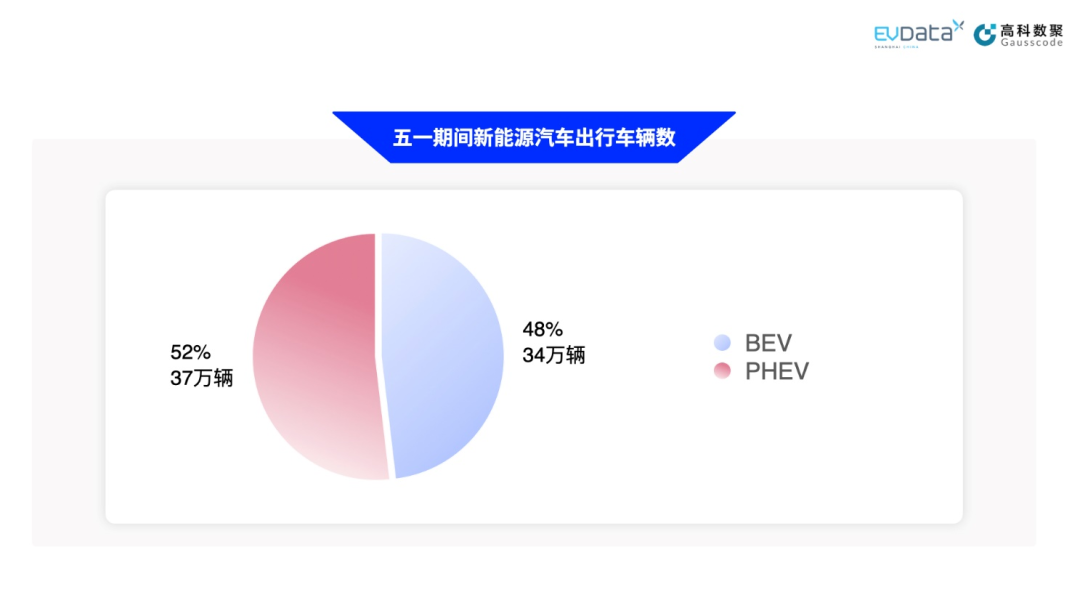 五一期间,数据中心选取了4月27日至5月3日的车辆运行数据进行分析和展示。期间约有71万辆新能源汽车出行,其中BEV约34万辆,占比48%,PHEV约有37万辆,占比52%。