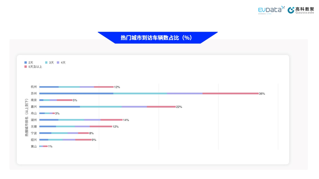 一方面,热门城市的新能源汽车到访量明显受热搜排名影响,即其所代表的旅游资源的影响。如湖州(约148km)和无锡(距上海约134km)在距离接近的情况下,热搜排名较前的湖州(莫干山、南浔古镇等)相较无锡(鼋头渚等)有明显更高的到访量。另一方面,到访量也受距离限制。如坐拥丰富旅游资源的南京(距上海约299km),到访量却在前十城市中略低;在南京到访车辆的组成中,单次离沪5天及以上车辆的占比较大,也进一步印证了目的地城市对新能源车主的吸引受距离(或时间)限制。